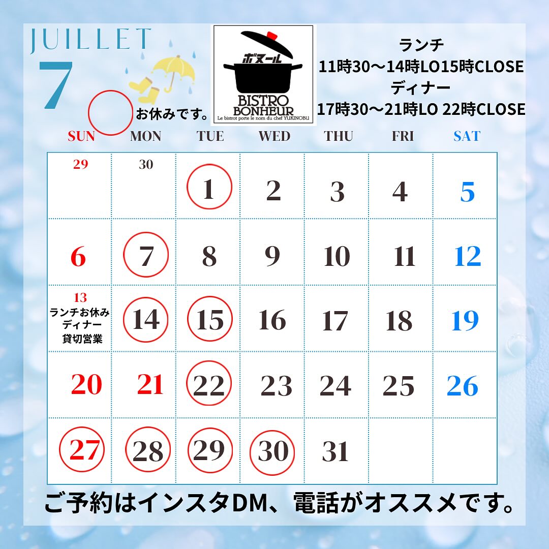 こんばんは、 BISTRO BONHEURのインスタグラムをご覧いただきありがとうございます😊 7月の営業カレンダー📅になります。 今月も変則的なお休みでご迷惑をおかけしますが是非ご予約、お問い合わせお待ちしております。 ※尚ほぼワンオペ営業して電話に出れない場合があります。 ご迷惑をおかけしますが宜しくお願い致します。 #ビストロボヌール #久が原グルメ #大田区ランチ #大田区ディナー #久が原ビストロ #東京ビストロ #ワンオペ営業 #営業カレンダー #7月営業日 #久が原ランチ #久が原ディナー #季節の料理 #隠れ家ビストロ #予約優先 #大田区ごはん #駅近グルメ #カジュアルフレンチ #ほぼワンオペ #ありがとうの気持ち #また来たくなるお店
