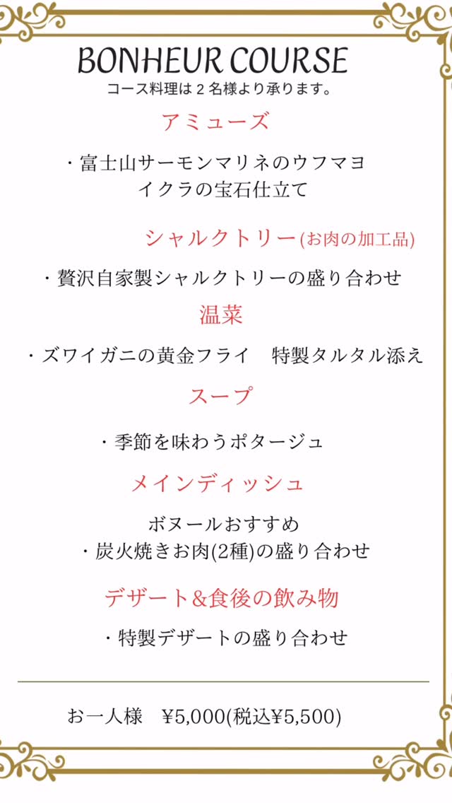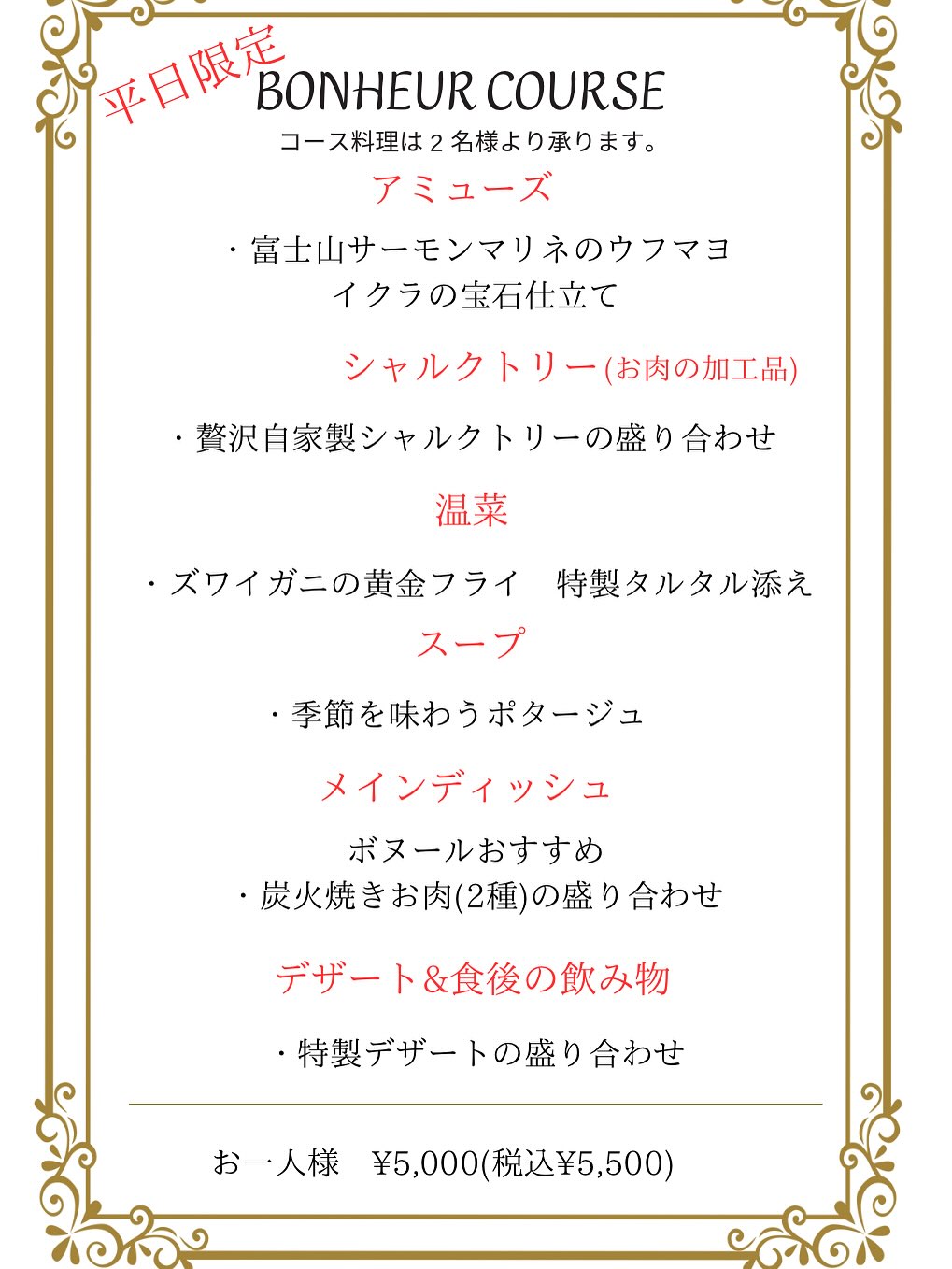 こんばんは。 ビストロボヌールのインスタグラムをご覧いただきありがとうございます😊 平日限定ディナーコースのご紹介です📢 アミューズは、 富士山サーモンのマリネとイクラのウフマヨから。 自家製シャルクトリーの盛り合わせ、 炭火焼きお肉2種の盛り合わせなど、 ボヌールの夜の定番を、コース仕立てでゆっくりとお楽しみいただけます。 平日の夜、 大切な方と肩肘張らずに過ごす、少し贅沢なひとときに🍷 記念日でなくても、ふらっと立ち寄れる ちょうどいい特別感のあるディナーコースです。 ぜひ、ゆったりとした時間をお過ごしください🍽️ ご来店を心よりお待ちしております。 #ビストロ #フレンチ #ディナー #ワイン好き #大田区グルメ