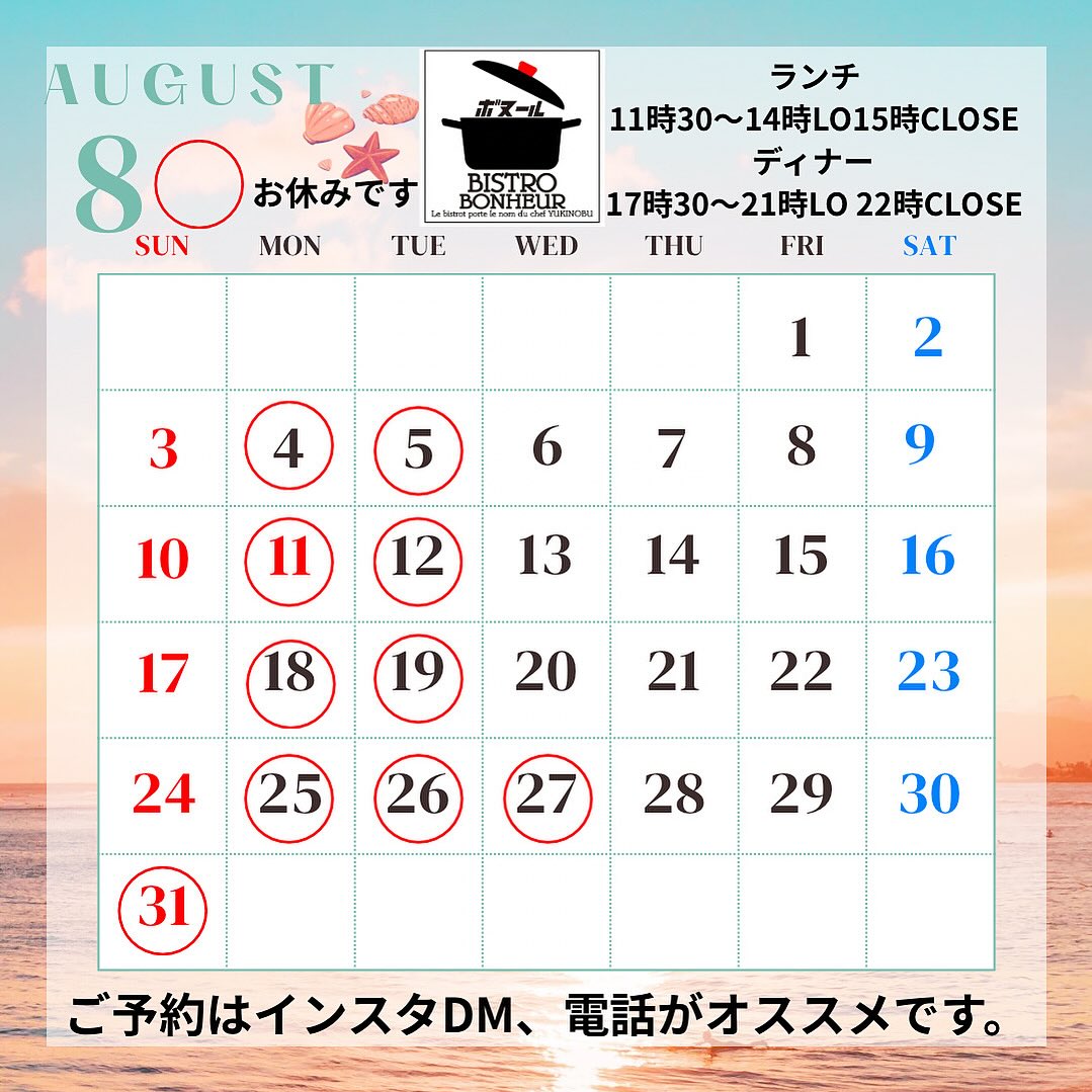 おはようございます🌞 ビストロボヌールのインスタグラムをご覧いただきありがとうございます😊 8月の営業カレンダー📅になります。 8月は月曜、火曜にお休みが変更になっております。 尚13日(水)ランチ 貸切 17日(日) ディナー 貸切になっております。 ご予約お問い合わせお待ちしております。 ※ほぼワンオペ営業の為、営業中電話対応できない場合があります。 ご迷惑をおかけしますが宜しくお願い致します🙇 #ビストロボヌール #久が原ランチ #久が原ディナー #大田区グルメ #久が原ビストロ #8月営業カレンダー #夏のフレンチ #大田区ランチ #大田区ディナー #貸切ランチ #貸切ディナー #ワンオペ営業 #おしゃれランチ #ご褒美ごはん #カップルディナー #ママ友ランチ会 #夫婦ディナー #記念日ディナー #気軽にフレンチ #東京ビストロ