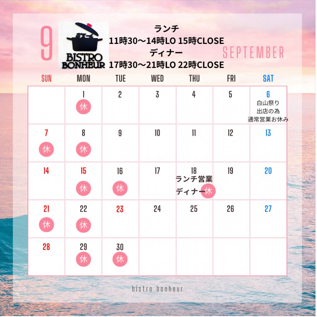 こんばんは🌙 ビストロボヌールのインスタグラムをご覧いただきありがとうございます。 9月の営業カレンダー🗓️のご案内です。 まだまだ暑い日が続き、食欲も落ちやすい季節ですが、ボヌールでほっとひと息。 大切な方と幸せなひとときをお過ごしいただければ嬉しいです✨ #ビストロボヌール #大田区グルメ #久が原ランチ #久が原ディナー #大田区ビストロ #ボヌール時間 #9月の営業カレンダー #ご褒美ごはん #幸せなひととき #美味しい時間 #カップルディナー #ママ友ランチ #夫婦ごはん #記念日ディナー #隠れ家ビストロ #お洒落ランチ #お洒落ディナー #季節の食材 #グルメな時間 #大田区ごはん