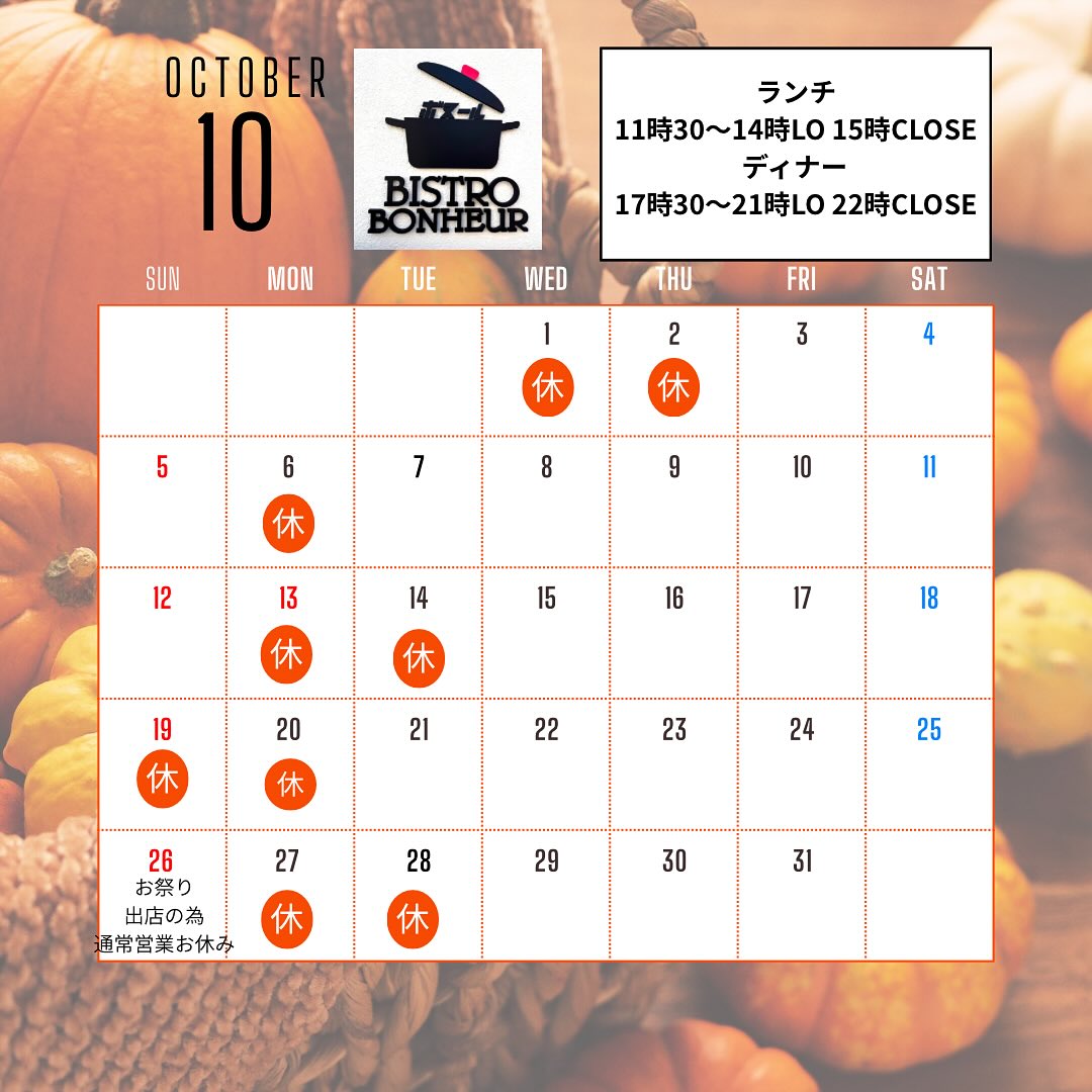 こんばんは🌙 池上線・久が原駅徒歩3分の ビストロボヌール です🍷 いつもご覧いただきありがとうございます😊 ✨来月の営業カレンダー🗓️✨ が完成しました! 秋も深まる季節🍂 美味しいお料理とワインでゆったりとした時間をお過ごしください🍽️ ご予約はインスタトップの ホームページリンク🔗 から簡単にできます☺️ 皆さまのご来店、心よりお待ちしております✨ #ビストロボヌール #久が原グルメ #大田区ランチ #大田区ディナー #池上線グルメ #東京ビストロ #フレンチ好きな人と繋がりたい #グルメ女子 #ワイン好きな人と繋がりたい #ママ友ランチ #ご夫婦ディナー #カップルディナー #ワインと料理 #隠れ家レストラン #大人の時間 #記念日ディナー #久が原カフェ #久が原ディナー #ボヌール時間 #食欲の秋