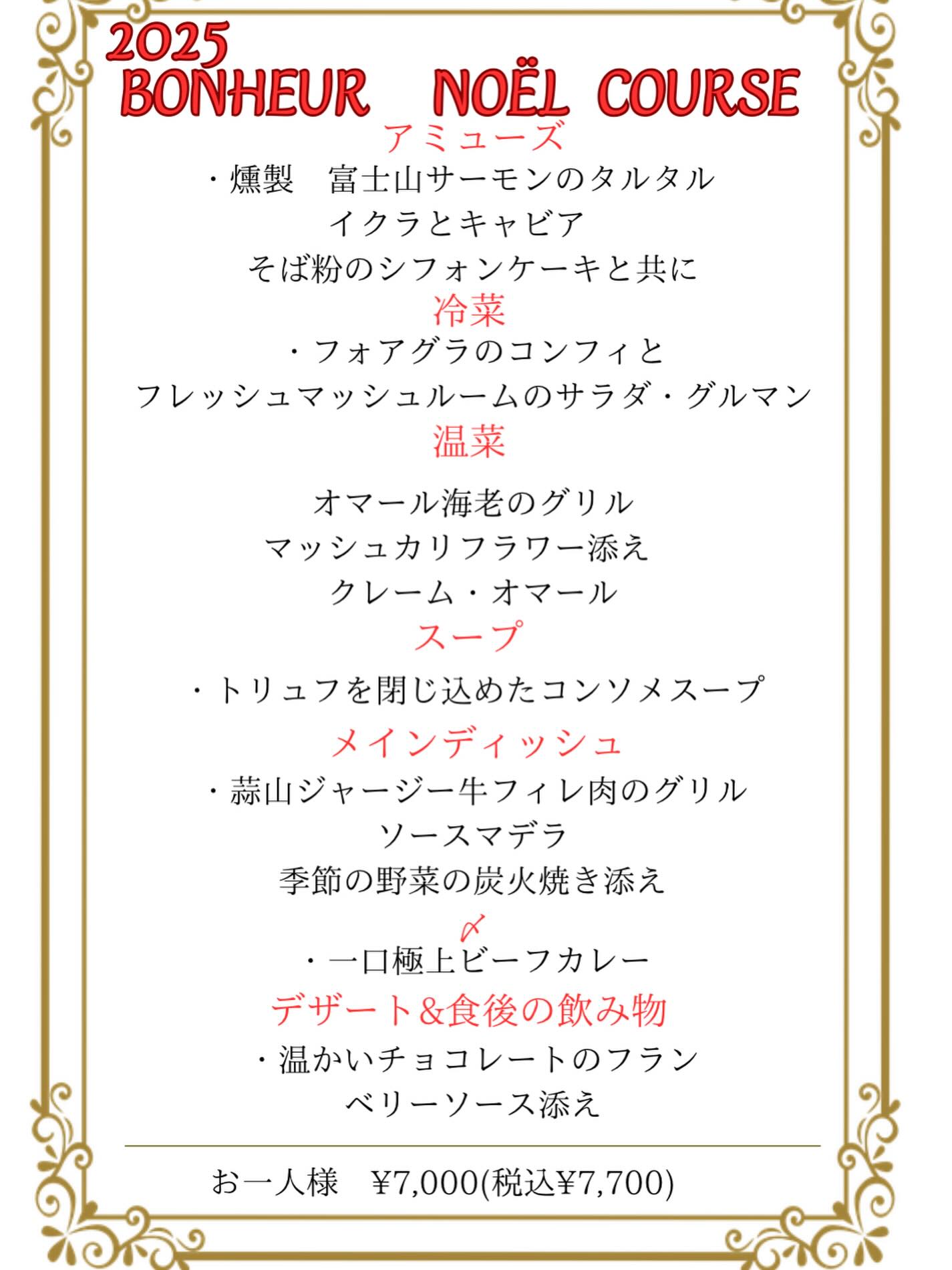 ビストロボヌールのInstagramをご覧いただき、ありがとうございます😊 お待たせいたしました。 ご予約限定‼️23、24、25日ディナーでの お得な‼️ 2025〈ボヌール ノエルコース〉(税込7,700円) のご案内です🎄 当店にとって初めて迎えるクリスマス。 せっかくなら、お越しいただく皆さまに “今年一番の幸せな時間” を味わっていただきたい—— そんな思いで、贅沢なコースをご用意しました。 イクラやキャビア、フォアグラ、オマール海老、牛フィレなど 特別な夜にふさわしい豪華食材を、ボヌールならではのバランスで丁寧に盛り込みました✨ さらに、料理に寄り添う 3杯のワインペアリング泡、白、赤(+税込3,300円) を合わせた 《ノエルペアリングコース》は、とてもお得な内容となっております🍷 大切な方とのクリスマスに、ぜひボヌールで心温まるひとときをお過ごしください😌 ※こちらのコースは ご予約制 となります🎄 #ビストロボヌール #久が原グルメ #大田区ディナー #クリスマスディナー2025 #ノエルコース #クリスマス限定コース #フレンチディナー #オマール海老 #牛フィレ #フォアグラ料理 #ワインペアリング #特別な夜 #贅沢ディナー #大人の時間 #ご褒美ディナー #記念日ディナー #グルメ好きな人と繋がりたい #久が原ディナー #大田区フレンチ #bonheur