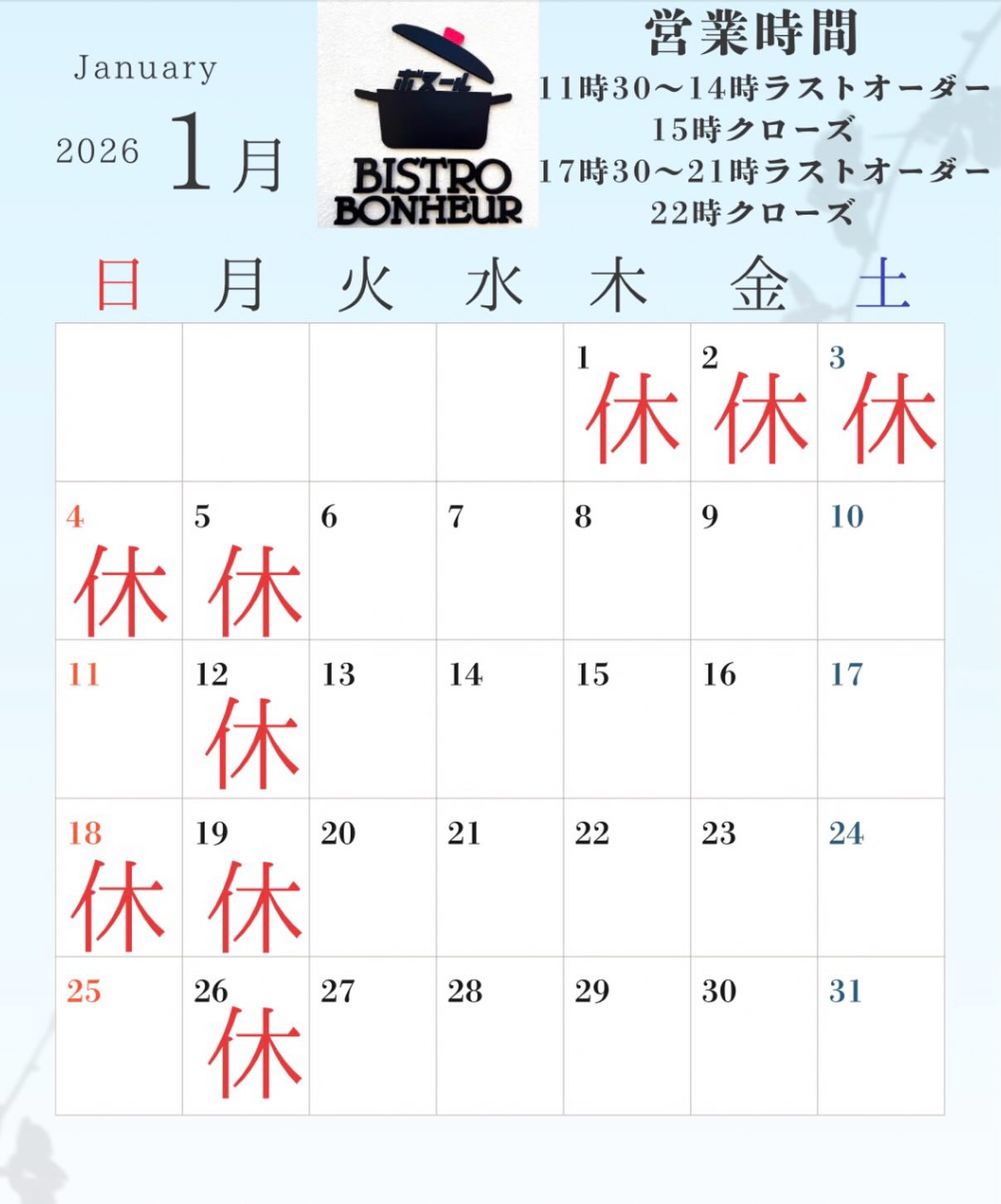 ビストロボヌールのインスタグラムをご覧いただきありがとうございます😊 2025年 無事に営業終了しました😌 今年の2月にオープンして毎日が充実し本当にあっと言う間に年末になりました。 沢山のお客様のご来店、『美味しかった』 『幸せ』など嬉しいお言葉もいただき本当にありがとうございます😭 まだまだビストロボヌールは生まれたてなので、これからますますお客様に喜んでいただけるよう2026年も精進していきます。 引き続き皆様の応援📣宜しくお願い致します🙇 こちらは1月のカレンダー🗓️になります。 ホームページのネット予約も解放してます。 来年も宜しくお願い致します。  皆様良いお年をお迎えください🎍 最後になりますが、ボヌールを支えてくれている生者者様、業者様、家族、お客様ありがとうございます😊 BISTRO BONHEUR 佐々木 幸伸 #ビストロボヌール #久が原グルメ #大田区グルメ #街ビストロ #今年もありがとうございました
