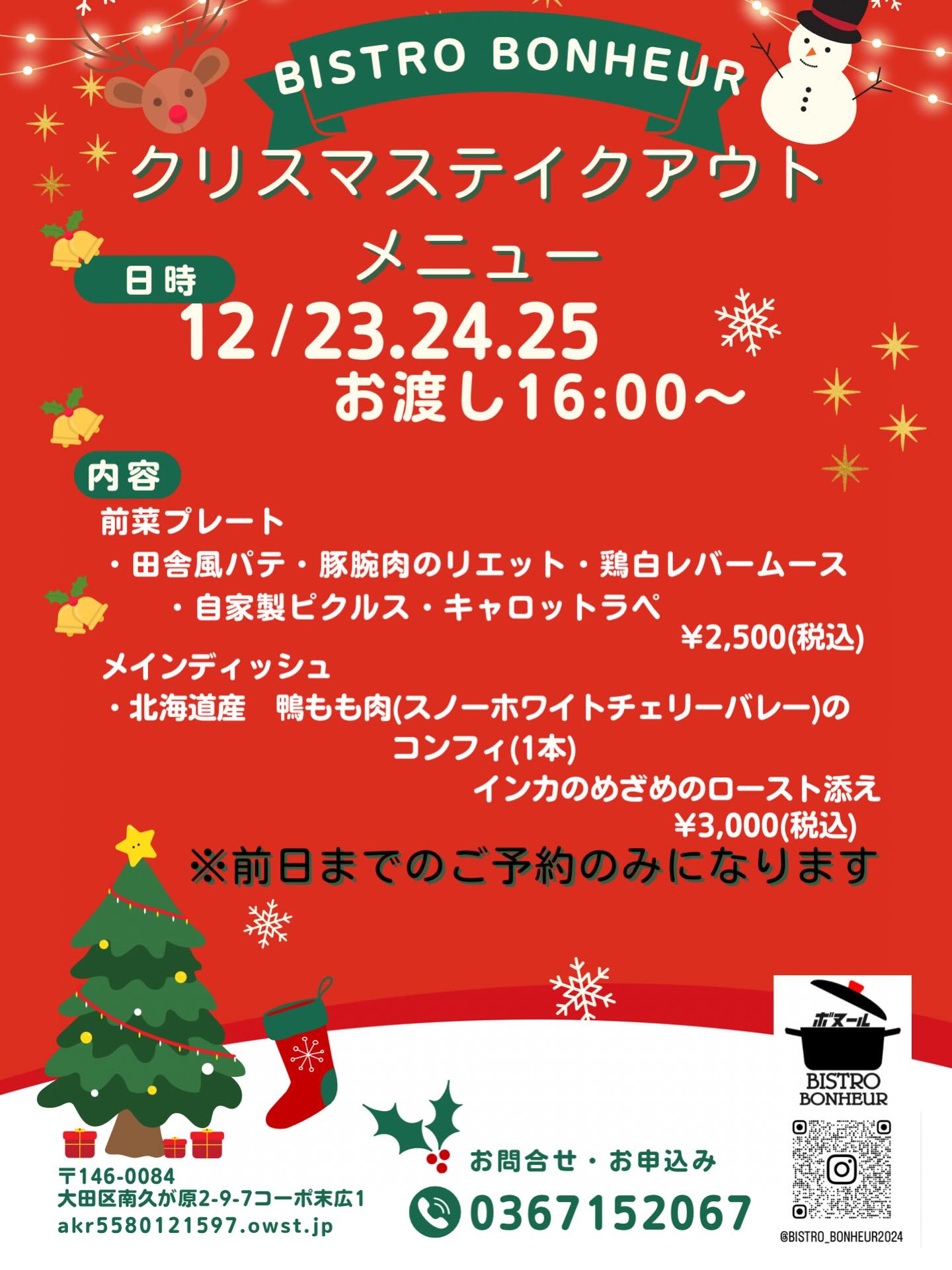 おはようございます☀ ビストロボヌールのインスタグラムをご覧いただきありがとうございます😊 いまさらながら…😅 数量限定‼️ クリスマステイクアウトのご案内です🎄 🍽️ 前菜プレート(税込¥2,500) ボヌール定番の ・田舎風パテ ・鶏白レバーのムース ・豚肉のリエット 人気の前菜をワンプレートに✨ 🍗 メインディッシュ(税込¥3,000) 北海道産鴨もも肉 スノーホワイトチェリーバレーのコンフィ(1本) インカのめざめのロースト添え 「今年のクリスマス、どうしよう?」と まだ迷っている方へ🎄 ご自宅でボヌールの味をお楽しみください🍽️ ※テイクアウトは 前日までのご予約・数量限定販売となります。 ご予約・お問い合わせ、お待ちしております😊 #ビストロボヌール #bistrobonheur #大田区グルメ #久が原グルメ #池上線グルメ #東京ビストロ #クリスマステイクアウト #おうちクリスマス #おうちビストロ #クリスマスディナー #数量限定 #鴨のコンフィ #スノーホワイトチェリーバレー #前菜盛り合わせ #ワインに合う #夫婦ディナー #カップルディナー #ママ友ランチ #ご褒美ごはん #予約制