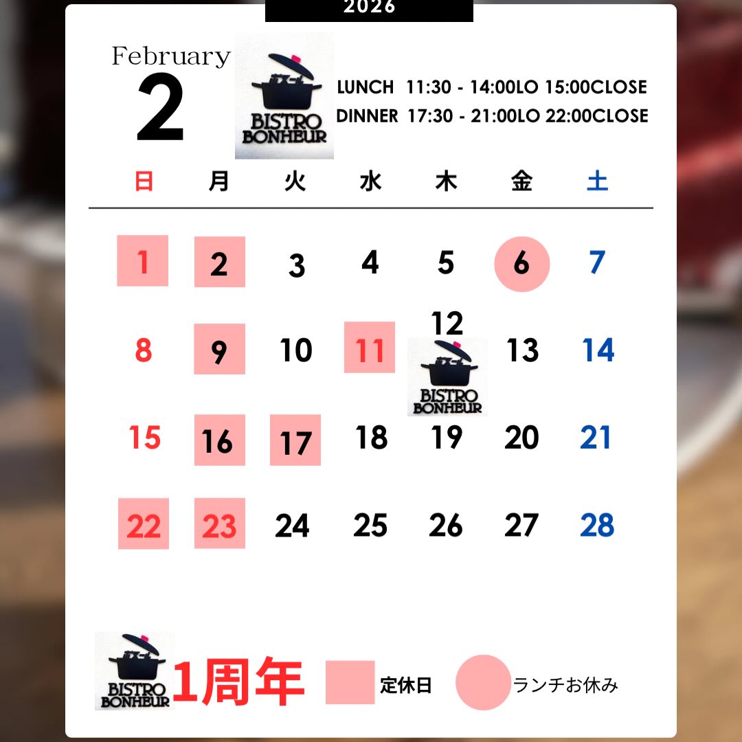 いつもビストロボヌールをご利用いただきありがとうございます😊 先日投稿した2月の営業カレンダーにつきまして、 お休みが1日変更となりました。 ご予定を立ててくださっていたお客様には、 ご迷惑をおかけしてしまい大変申し訳ありません🙇‍♂️ 最新の営業日は、こちらのカレンダーをご確認ください。 どうぞお間違えのないようお願いいたします。 2月12日には1周年も迎えます🎉 感謝の気持ちを込めて、皆さまをお迎えできればと思っております。 ご来店を心よりお待ちしております🍽️✨ #ビストロボヌール #久が原グルメ #営業日のお知らせ #2月営業カレンダー #1周年