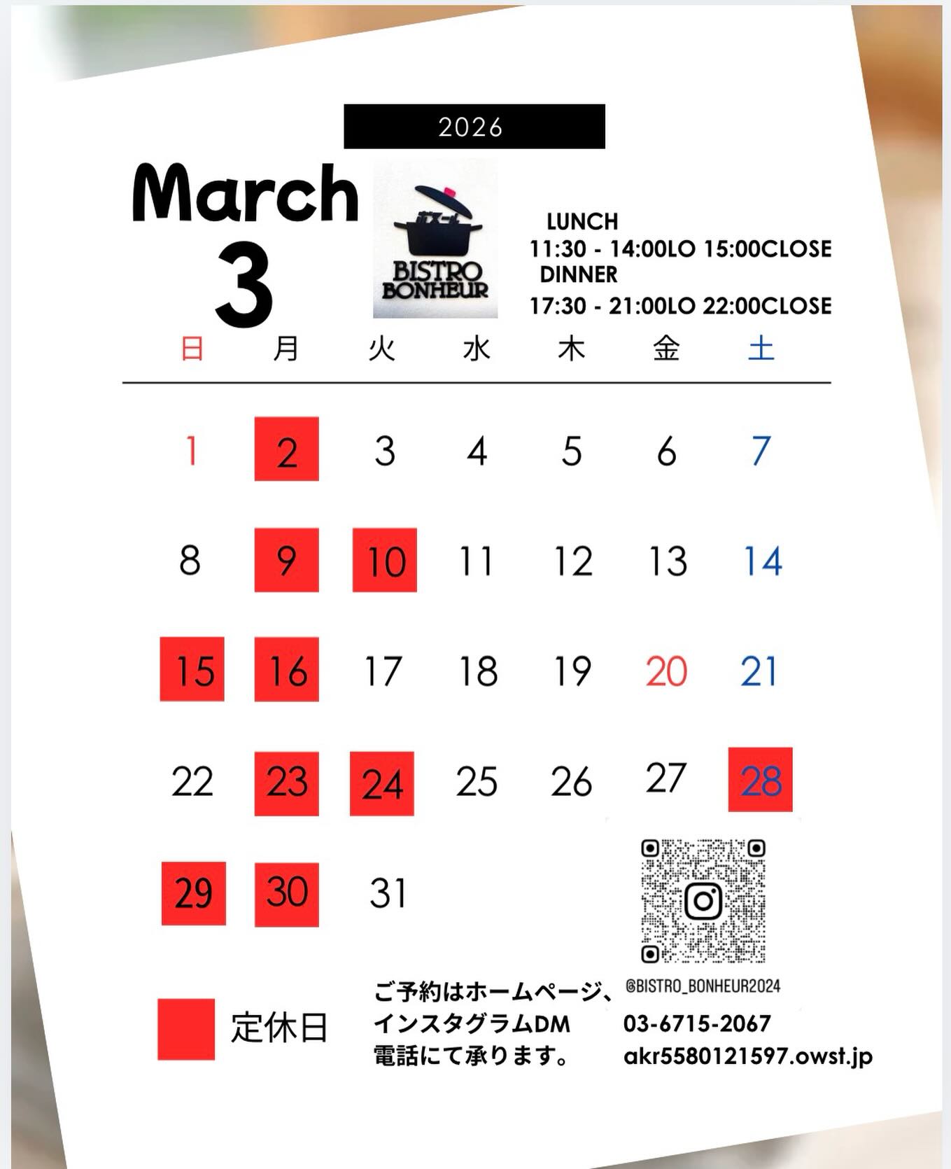 こんばんは。 ビストロボヌールのInstagramをご覧いただきありがとうございます😊 遅くなりましたが、3月の営業カレンダーを投稿いたします🗓️ 平日ディナーは比較的ゆったりとお過ごしいただける日が多く、 落ち着いた空間でゆっくりお食事を楽しみたい方におすすめです🍷 歓送迎会やちょっとしたお祝い、ご夫婦やカップルでのご利用もぜひ。 ご予約はプロフィールのホームページより承っております。 3月もビストロボヌールで、皆さまのご来店を心よりお待ちしております🍽️✨ #ビストロボヌール #BISTROBONHEUR #久が原グルメ #大田区グルメ #東急池上線グルメ