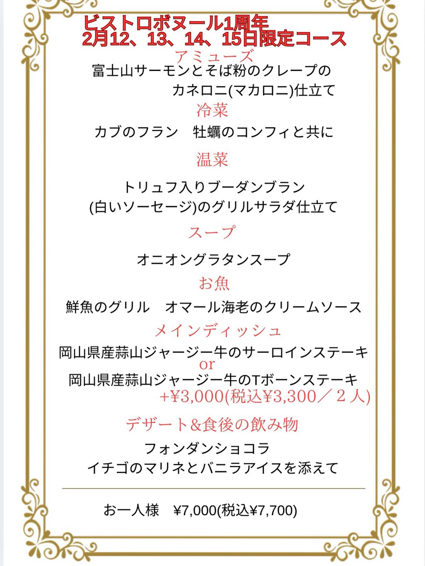 こんばんは、ビストロボヌールのインスタグラムをご覧いただきありがとうございます😊 投稿が遅くなってしまい申し訳ありません🙇 1周年記念・期間限定ディナーコースのご紹介です🍳 アミューズから始まり、冷菜・温菜・スープ・お魚料理、 選べるメインディッシュ、デザートまで 全7皿の特別コースをご用意しました。 お一人様 7,700円(税込) または 9,350円(税込)(Tボーンステーキ選択時) メインディッシュのTボーンステーキは、 ステーキハウス勤務時代に数多く焼かせていただいた思い入れの一皿です🍖 ※数量限定、仕入れ状況により内容が一部変更になる場合がございます。 ぜひこの機会にご予約お待ちしております。 あわせて、前回投稿でご紹介したケンゾーエステイトのグラスワインもぜひお楽しみください🍷 #ビストロボヌール #大田区グルメ #久が原グルメ #記念日ディナー #フレンチビストロ